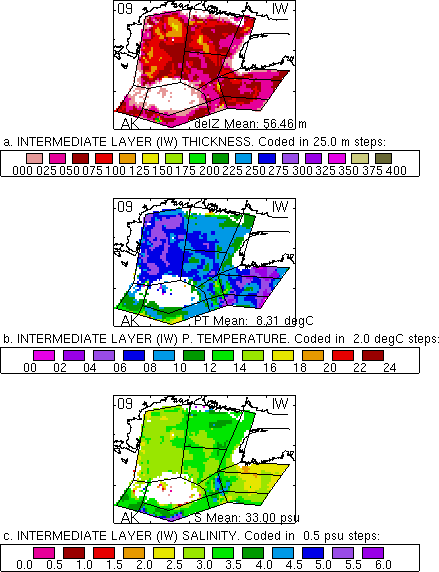 Figure 2. September intermediate layer (a) thickness, (b) vertically averaged layer temperature, and (c) vertically averaged layer salinity [psu]. Note indications of warmer and salty intermediate water formation in the northeast.