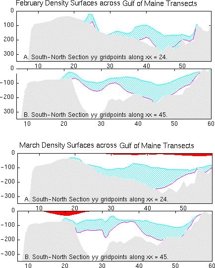 Figure 3. Vertical density layer sections during February and March for transects across (from left to right) the eastern Georges Bank and WIlkinson Basin (A) or Northeast Peak and Jordan Basic (B). Note how bottom water (blue hatched) extends from the Basins up on to the Bank, suggesting a bankward isopycnal route for Calanus f.. Also note the relative absense of surface water (red) during late winter.