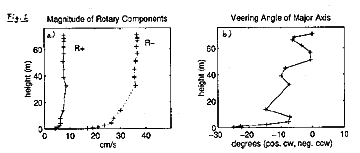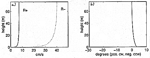 A tidal analysis is conducted on the BASS and VMCM data, and the rotary components of the tidal constituents are computed. The magnitudes and phase angles of the rotary components of the dominant tidal constituent, the M2 tide, are shown in Figure 1. From Figure 1a it can be seen that the boundary layer thickness of the anticlockwise rotating component, R+, is smaller than that of the clockwise rotating component, R-. This is due to the fact that the anticlockwise rotation of R+ enhances the effect of the Coriolis force, while the clockwise rotation of R- opposes it. The major axis of the current ellipse, PHImax , is found to rotate anticlockwise away from the bottom (Figure 1b).