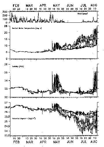 Initial look at the seven raw temperature records indicate very little thermal stratification until late May. The biggest signal in the four salinity records is a week-long influx of slope-like water at this same time. The three current records (15, 35, and 62 meters) recorded several wind-driven events during the first half of the deployment including four westward events in March, one eastward event in early April, and a westward event in early May. While the monthly mean flow (Feb-Jul) was affected by these events, the magnitude is still within the low-frequency standard deviations as reported by Butman and Beardsley (1987) for station "A" (1975-79, 85m) on the southern flank. There was a general increase in both the monthly mean magnitude and vertical shear.