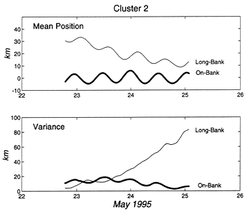Data from the second cluster, which consisted of 6 drifters deployed in a 3.5 km square area, allow examination of small-scale dispersion over the southern flank. The role of tides in advecting and mixing this cluster can be deduced by comparing the record of the cluster's mean position with the variance of the drifter locations with respect to the mean position (Figure 1). While tidal oscillations are prominent in the both the on bank and along bank components of mean position, they make relatively minor contributions to changes in position variance. This implies that the tide varies on a spatial scale much larger than the cluster size. The plot of cluster variance further shows anisotropic dispersion of the cluster, marked by a significant stretching of the cluster in the along-bank direction coupled with a compression of the cluster in the on-bank direction. The rate of increase in the along-bank cluster variance gives an along-bank horizontal diffusion coefficient of 3 x 106 cm2s. In future work, we will compare dynamical properties determined from the cluster data (i.e., correlation time-scales, velocity convergence, etc.) with those determined from the moored instrument records.