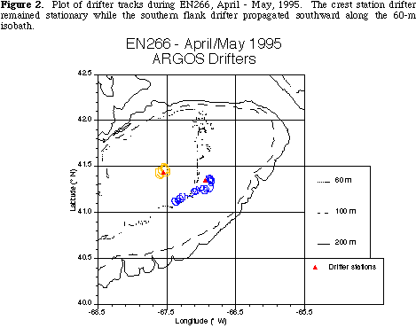 Detailed, although short-term, views of near-surface flow over the southern flank are provided by the tracks of two drifter clusters set out during the May 1995 cruise.