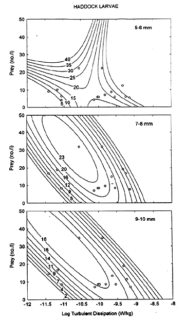 Theoretical studies have shown a feeding maxima that depends on the turbulence level and behavior of the predator and prey. Highly turbulent conditions are predicted to reduce larval feeding rates. Previous work by Lough and Mountain (1995) on feeding data from May 1981 and 1983 indicated an interaction effect where the maximum feeding response occurred at the highest prey densities observed and the lower turbulence levels ( Figure 1). The maximum feeding response continues at lower prey densities with increasing turbulence up to some intermediate level and then declines. It seems intuitive that an optimum level exists where stratification can aggregate prey while mixing at moderate levels can increase the probability of contacts between larvae and their prey. At higher levels of turbulence the enhancement of contact rates may be negated by the interruption of the pursuit process, resulting in a lower ingestion rate. In nature there probably is an optimum balance between the processes of mixing and stratification which results in maximum feeding, growth and survival of larvae. By residing near the pycnocline where there is a sharp gradient in turbulence, larvae have a greater probability of encountering optimum feeding conditions within a short distance vertically, especially first-feeding larvae with limited swiming ability.