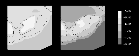 Figure 1. Vertically averaged turbulent kinetic energy dissipation rate (LOG10 [W kg**-1]) contour plots for climatological winter (left panel) and summer (right panel) conditions on Georges Bank (the 60 and 100 m isobaths are included for reference).