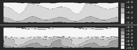 Figure 3. Vertical structure of the turbulent kinetic energy dissipation rate (LOG10 [W kg**-1]) as a function of time (horizontal axis) for the summer simulation at two locations on the southern flank transect shown in Figure 2. The total depth for the upper (lower) panel is 40 (80) m. The temporal duration for the plots is two tidal periods.