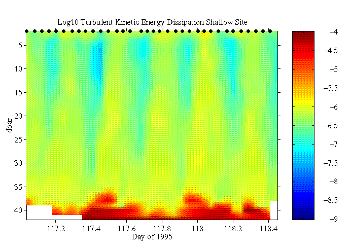 In the summer, tidal-time variations of the turbulent kinetic energy dissipation rate at depth approach one order of magnitude within the vertically well mixed region (Figure 3 - top panel - shown for a depth of 40 m) and two orders of magnitude in the stratified region (Figure 3 - bottom panel - shown for a depth of 80 m).