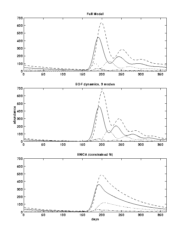 We examine development of an initial pulse, flow over one- and two-dimensional topography, and nonlinear interactions with a food source. In all these problems, the full 200 variable system can be adequately reproduced using between 5 and 15 modes (Figure 1). The reduced models are generally much more accurate than a "grouped" model (e.g., an Eggs- Nauplii- Copepodid- Adult representation). A second advantage is that the EOF reduction does not have adjustable parameters (other than the number of modes to include). The EOF approach allows the important aspects of detailed biological interactions (i.e., more realism) to be included in a large-scale physical model.