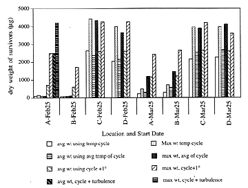Previous individual-based modeling studies have investigated the effects of variability in prey density and turbulence on first feeding cod and haddock larvae (Werner et al., 1994). We have developed an individual-based model, based on the model of Laurence (1985), that includes these factors and the effect of varying temperature. Temperature effects were included by using a Q10 type adjustment to the metabolic rate. Besides affecting metabolic weight loss, temperature also may affect the swimming speed, capture efficiency, and general "liveliness" of a fish (Brown et al., 1989). Therefore, a second temperature dependent term was added to the overall ingestion ability of our model fish. We have also developed a scheme to convert total prey mass per unit volume to a discrete number of prey items for the larval fish to encounter. Three cases were analyzed: 1) constant food and temperature conditions, 2) variable temperature cycles, and 3) variable temperature cycles and turbulence. Our model results showed that both the timing and location of cod and haddock spawning are crucial to the survival of the larvae (Figure 1). We also found that it is important to force the model with the temperature cycle and not just the average temperature over that cycle (Figure 2). Finally, turbulence may increase growth rates in clod locations where growth is limited by food and temperature, by increasing encounters with prey (Figure 2).