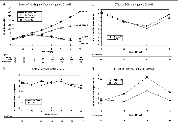 This led us to consider other possible advantages that mixing might confer on hydroid growth, including better oxygenation, waste removal and uptake of DOM. The former was discounted in that all experimental containers remained well oxygenated through-out the experiment. The possible role of DOM was tested by establishing two treatments of 10 replicates each: 1) a DOM treatment, consisting of filtered and autoclaved seawater with additions of 1 mM of glucose and 62.5 nM of 16 amino acids; and 2) a No DOM treatment consisting of filtered and autoclaved seawater only. After four days the results showed no significant differences in number of feeding hydranths between treatments
