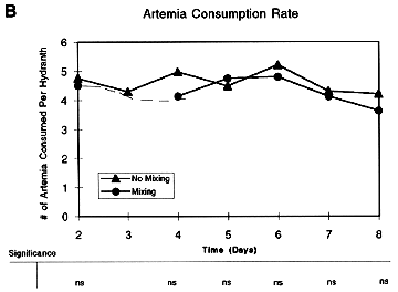 (Figure 1A). Although we initially thought this effect might be due to turbulence-enhanced feeding via greater predator-prey contact rates in the mixing treatments, a comparison of the consumption rates in the Mixing/Food versus No Mixing/Food treatments showed no significant differences between treatments
